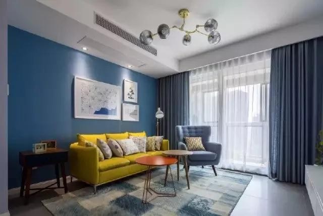 藍色背景墻+亮黃沙發讓空間主次分明。