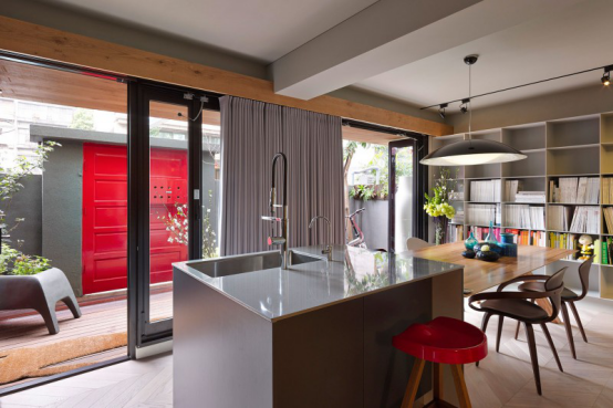 藍(lán)色花瓶、紅色座椅、淺灰色的吊燈也讓家變得跳動起來了。