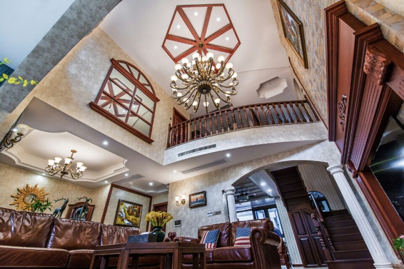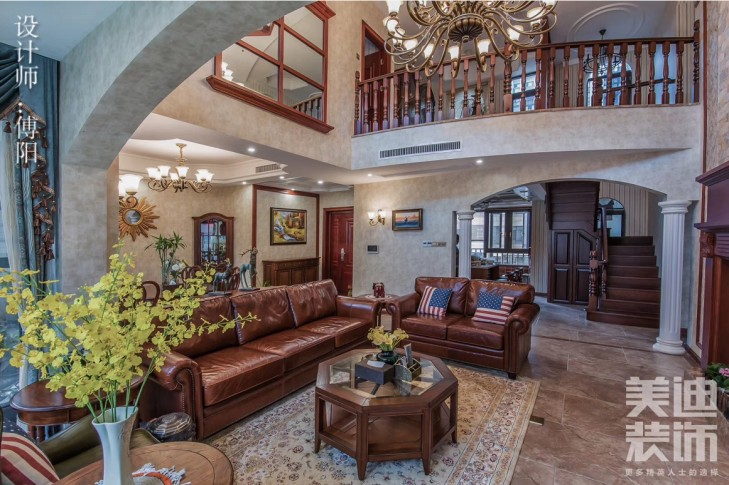 業(yè)主楊老師偏愛深色系帶來的沉穩(wěn)感,一眼便相中了美式風(fēng)格。設(shè)計師多處采用弧形設(shè)計,如弧形門洞、弧形樓梯、弧形欄桿等來打破空間的呆板,表達出美式風(fēng)格的自由與隨性。一步移景,亮皮沙發(fā),八角茶幾,地毯,壁畫等,家中的每件物品都能感受到屋主對品質(zhì)生活的追求。