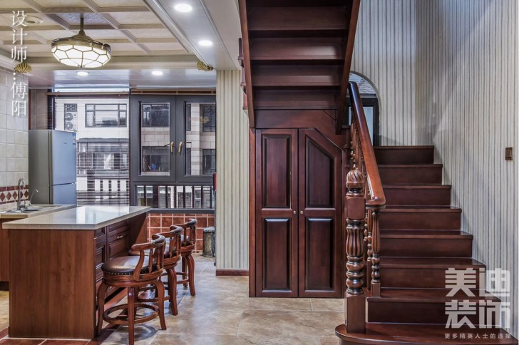設(shè)計師選擇疊起造型與擴板,既符合美式風(fēng)格又兼?zhèn)淠陀眯浴V袓u上加配吊扇性的美式燈,塑造空間看點。中間的“小房間”是設(shè)計師利用樓梯下方的空白區(qū)域做的一個收納空間,提升收納與空間使用率。