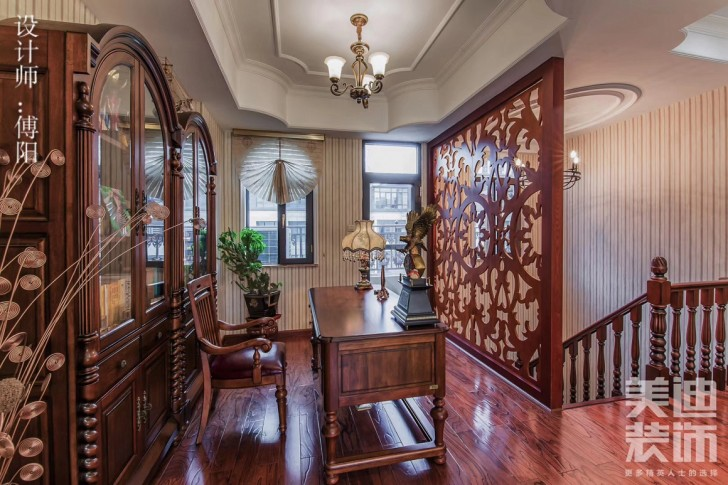 公共開放式書房,半通透太陽花隔斷取代樓梯間的墻體;從書房左側(cè)可進入露天陽臺,相融的空間處理,打開時不分你我相互溝通,關(guān)閉時各自分工互不打擾。同時,弧形吊頂與書柜頂部的弧形設(shè)計相呼應(yīng),讓美式風(fēng)格的味道肆意散發(fā)。