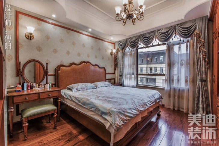 屋主購買的家具偏深黑色為主,加上面積不大,為緩解空間壓抑感,在顏色搭配上,設(shè)計師選用灰藍色的窗簾與床頭,提亮整個空間。床頭舍棄傳統(tǒng)美式規(guī)則,梳妝臺取代對稱結(jié)構(gòu)的床頭柜,成為臥室的另一道風(fēng)景線。