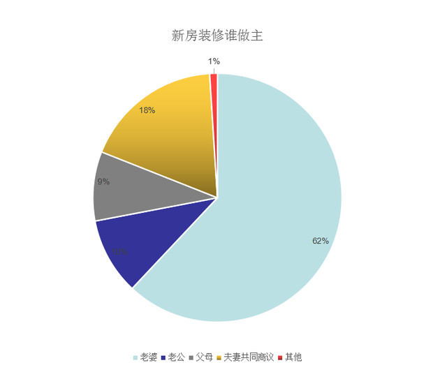根據調查結果顯示,超過60%的家庭在裝修的時候由老婆做主,18%的家庭選擇夫妻共同商議,9%的家庭選擇聽父母的意見。