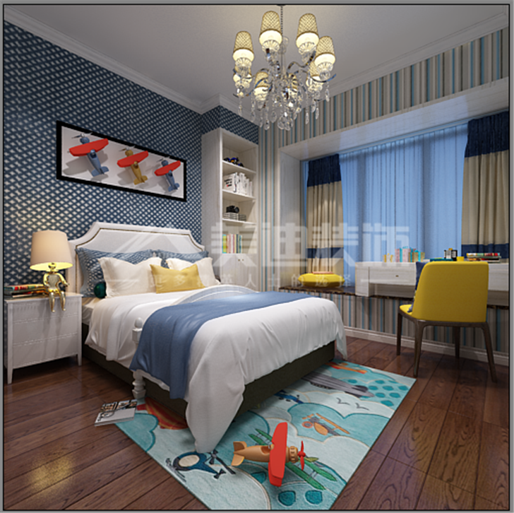 2、男孩的臥室要以中性或者冷色調居多,男孩子的房間可以用淺藍色、淺綠色、米黃色,原則是不要用太刺激、對比強烈的顏色。色彩不宜太雜,這樣會分散孩子的注意力,也不宜用白墻,因為孩子需要想象空間;色彩不能太暗,因為活潑年齡需要有活力的顏色裝點。