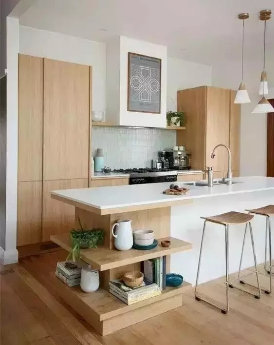 靠墻設置一個實用的餐邊架,可以將餐具等物品放置在上面,既美觀又方便取用而且還減少了廚房的收納壓力。
