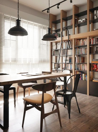 金屬和原木作為工業風的兩大標志元素,書房怎么能少了鐵藝木質書架,金屬的冷硬氣質和木材的質樸溫度,一起演繹工業風的鐵血柔情,冰冷中有溫柔。要想保持空間的流動感,最好選擇開放式設計,保持空間的流動感,待在書房也不會太過沉悶。
