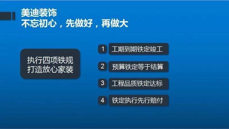 為把放心家裝標準執行到位,美迪裝飾還制定了“四項鐵規”,即工期到期鐵定竣工、預算鐵定等于結算、工程品質鐵定達標、鐵定執行先行賠付。“放心家裝是我們給消費者的結果,四項鐵規是我們對企業管理的要求,通過四項鐵規打造放心家裝,要讓消費者在家裝消費過程中擁有獲得感和安全感。”美迪裝飾集團董事長鐘菊成說。