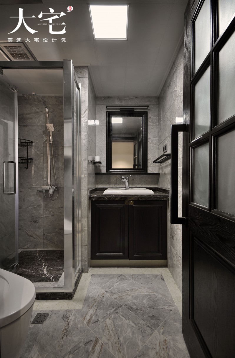 ▲衛生間用灰色系的大理石打造成一個深淺不一的紋理就像有故事的空間,清新淡雅。