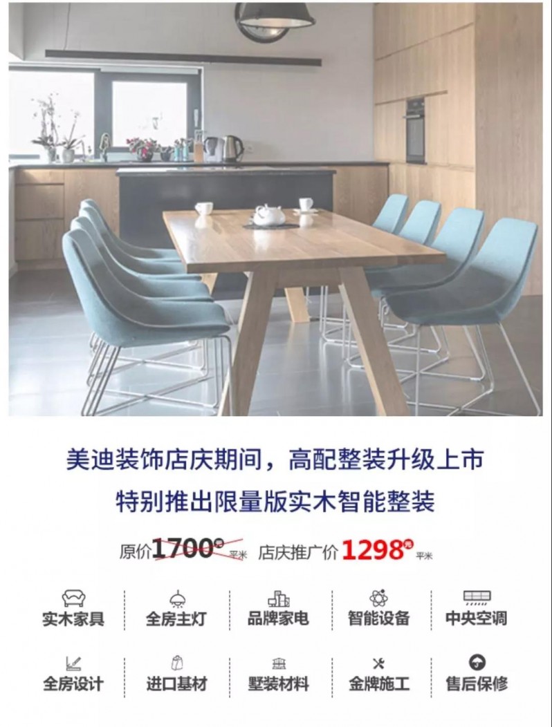 原價1700元/平米,店慶限時推廣價1298元/平米,全系墅裝主材+全系進口基材+全系生態實木免費升級+全房品牌家電大贈送+全房品牌家具大贈送+智能設備免費送。