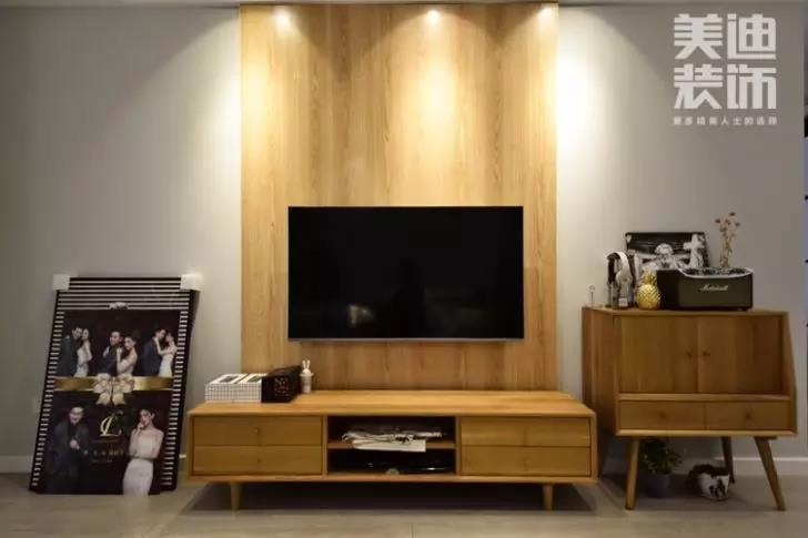 拍攝的照片,是屋主有入住半年。左側放著兩人甜蜜的結婚照,幸福肆意散發。中間木質背景墻在燈光下,獨有魅力且溫和。而右側柜體增加儲藏功能的同時,精致趣味的小擺件塑造出舒適之感。