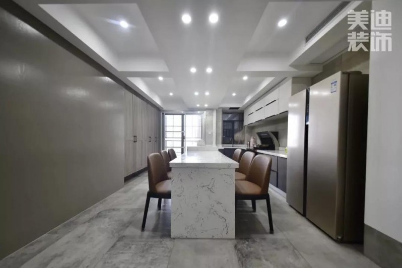 開(kāi)放式廚房顯得空間更為寬敞,設(shè)計(jì)師為主人量身定做的吧臺(tái)式餐桌,也使原本不夠大的區(qū)域,瞬間擴(kuò)大了幾分。