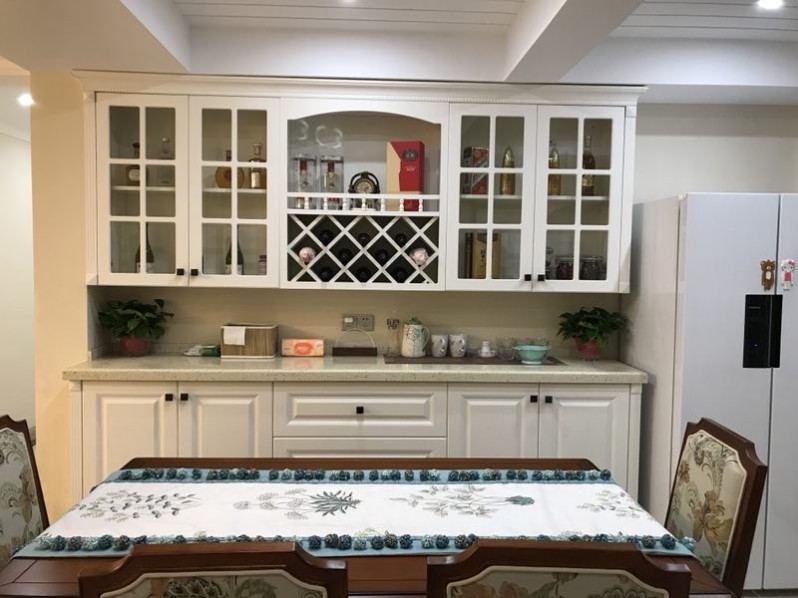 廚房空間有限,為了擴大廚房的操作空間,冰箱放在餐廳,與酒柜融為一體,功能與美觀兩不誤。在餐廳空間允許的條件下,設置定制酒柜來容納楊姐隨時的一些東西。其中,吊柜的多種造型滿足不同種類的物件擺放。