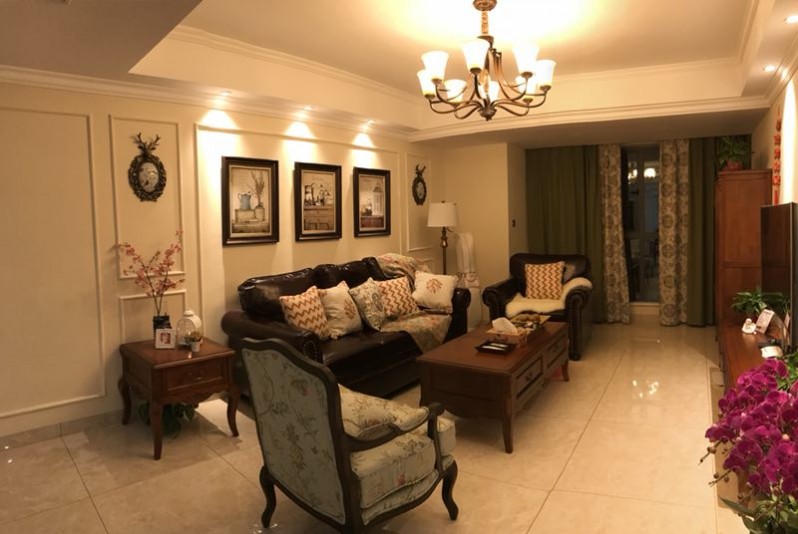 業主楊姐是第一次裝修,自己也不知道喜歡什么裝修風格。設計師劉麗娟在與楊姐的溝通過程中,發現楊姐喜歡深色家具,同時考慮到她的年齡與活波開朗的性格,最終設計成小美風。客廳處皮質的沙發配上花飾棉麻布藝單人椅,沉穩中帶著隨性自然,在燈光的照射下,溫馨的客廳讓人一眼就被吸引。