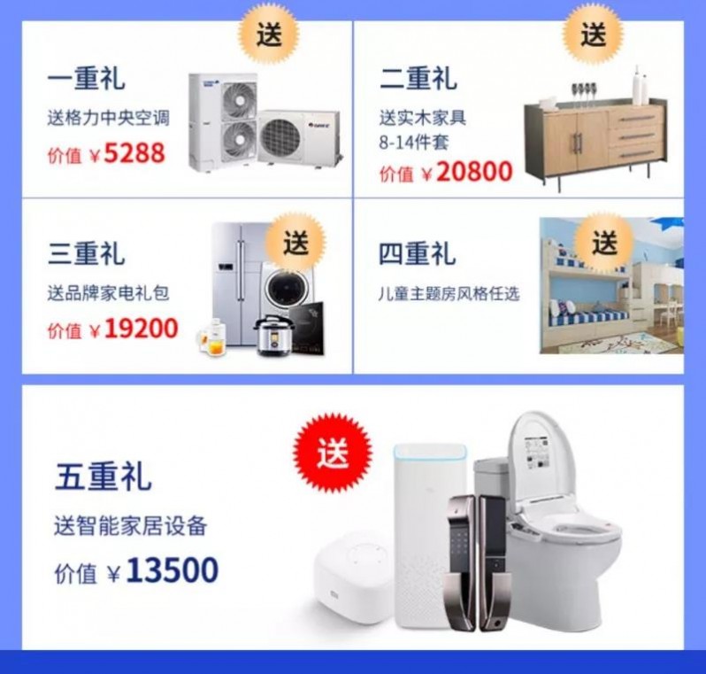 格力中央空調、8-14件套實木家具、品牌家電禮包、智能家居設備、兒童房;五重好禮,總有一款讓你心動。