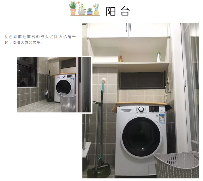 陽臺區域,在并不寬敞的空間內,通過定制的家具滿足功能及儲物需求,洗衣機上方空間也沒有浪費,裝個吊柜也是收納儲物的好地方。