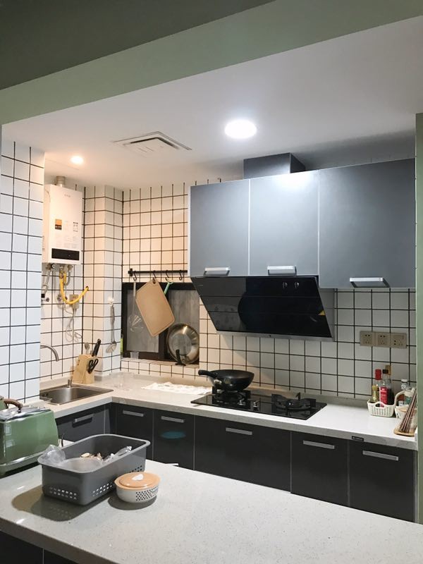 玄關旁邊就是廚房,開放式的客餐廳設計為小空間帶來更為通透靈活的視覺感受。廚房采光不好,墻面用小白磚有提亮作用。為了合理利用空間,制定了上下兩排廚柜,完全滿足日常需求。