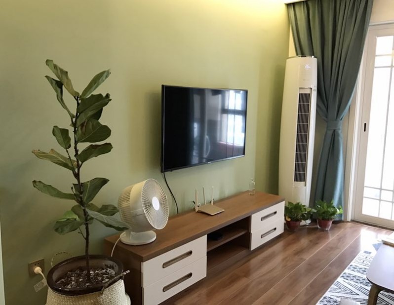客廳設計是滿滿的北歐風情,綠色的電視背景墻搭配木質地板,帶來清爽又溫潤的氣息,大扇玻璃窗為室內帶來充沛的采光。豐富的綠植,也是客廳的點綴,帶給室內明艷生機的氣息。