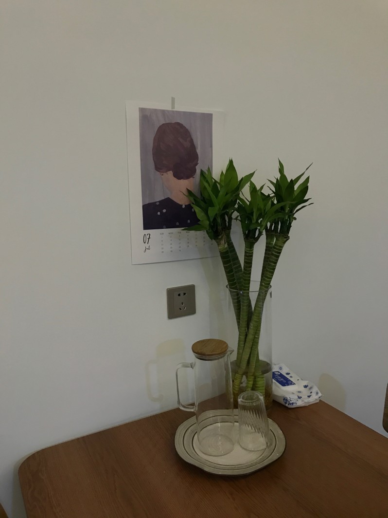廚房對面就是小餐桌,北歐風特點就是去除復雜的裝飾,簡單大方,墻上莫蘭迪色系的日歷畫,增加了裝飾元素。為使空間能夠多些活力,小屋內擺放了不少綠植。