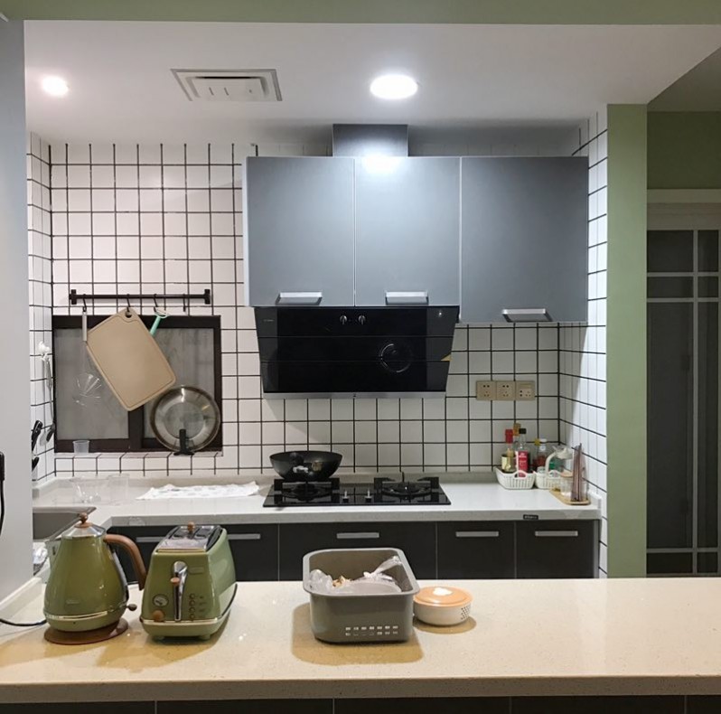 廚房連著吧臺,溫潤的奶白色大理石吧臺搭配優雅的灰綠色的小家電,竟然營造出日式安寧的空間氛圍。