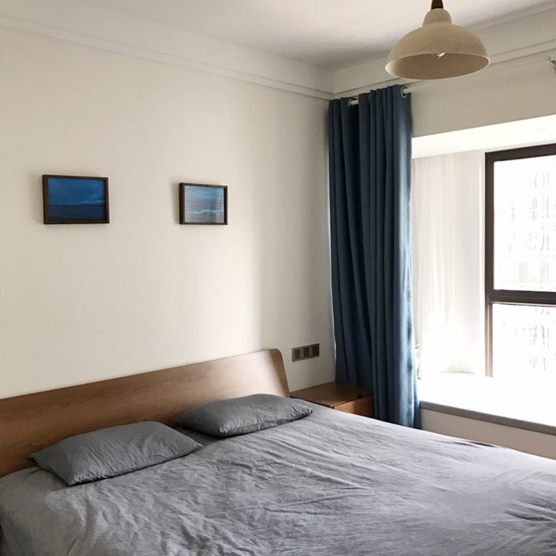 臥室設計也比較簡約,一張舒適的單人床搭配垂下來的吊燈,顯得更有設計感。水泥灰色布藝床上四件套,棉麻的材質舒適又親膚。除了客廳中、餐廳里看見的掛畫,臥室自然也少不了,床的背景墻也掛了兩幅裝飾畫。屋主很喜歡這種簡單搭配,真是永不過時。