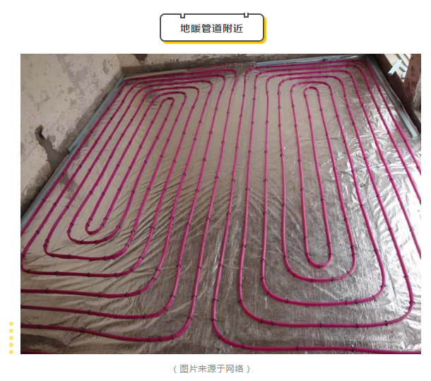 安裝地暖的家中,冬天取暖時,室內、外溫差較大,靠近門窗的地熱管道極易產生冷凝水,向下方混凝土滲透,所以安裝地暖的管道附近也需要做防水處理。