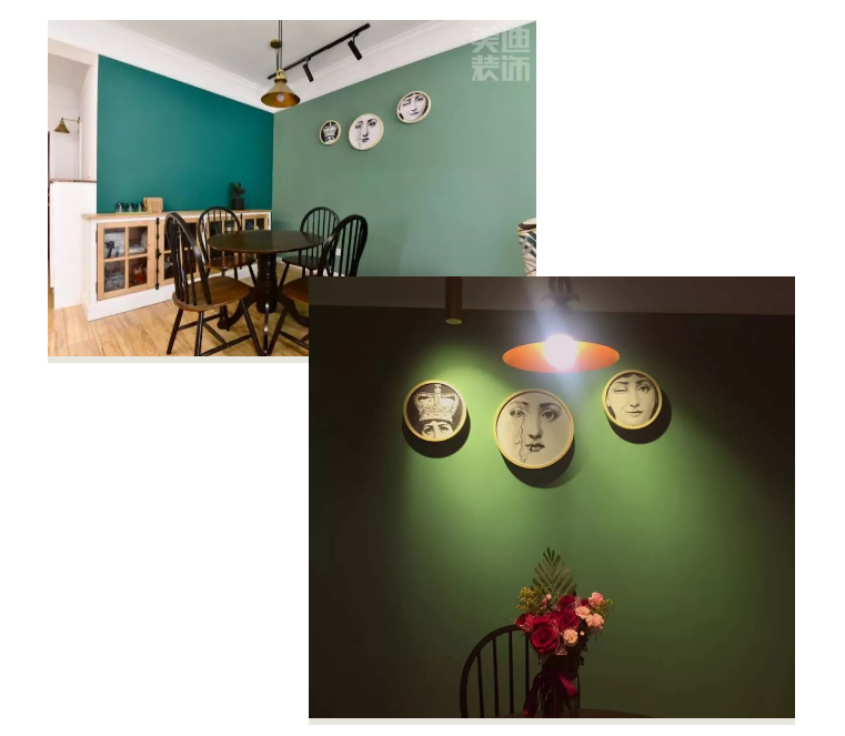 餐廳延續(xù)客廳的綠色與原木色基調(diào),并用兩種墨綠色形成對(duì)比來(lái)達(dá)到空間的層次感。同時(shí)為了緩解面積小造成的空間壓抑感,設(shè)計(jì)師沈文臻老師選用了成品裝飾柜來(lái)代替酒柜。