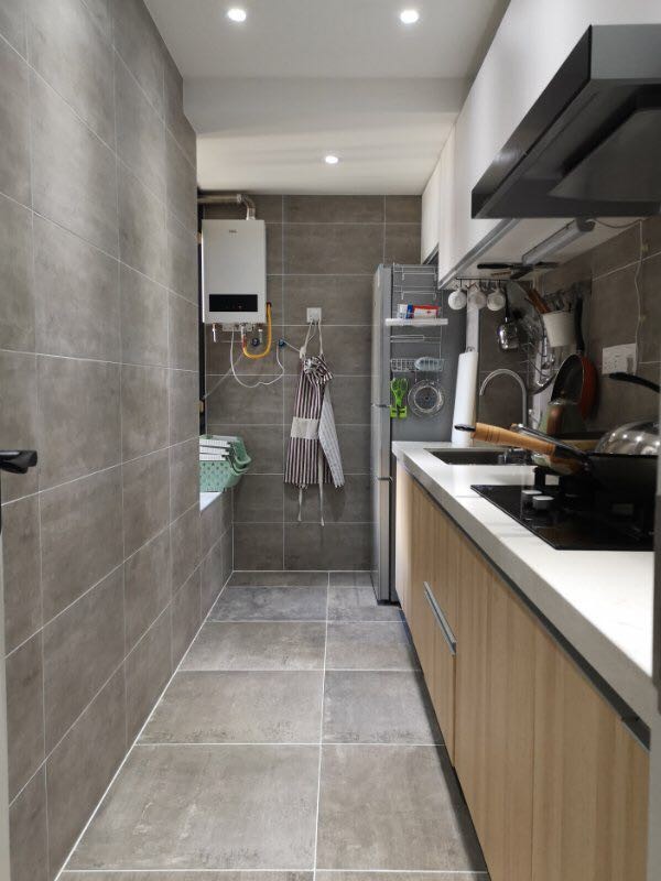 封閉式廚房,簡(jiǎn)單白色調(diào),十分喜歡料理的業(yè)主娟娟會(huì)經(jīng)常性在家做飯。設(shè)計(jì)上,選用硅鈣板吊頂加射燈,整個(gè)空間干凈清爽。