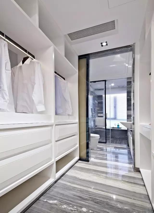主衛的通道,甚至是衛生間原本的干區,都可以改造利用起來,把主衛門外的兩側裝成步入式衣帽間,這樣利用也是不錯的選擇。