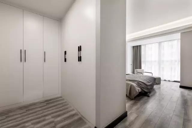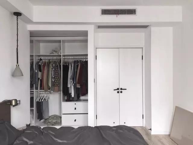 臥室里某一面墻較大的,可以把它利用起來裝成一整面的衣帽間,甚至可以通過開放式的掛鉤等形式,來實現自己夢寐以求的衣帽間小夢想。