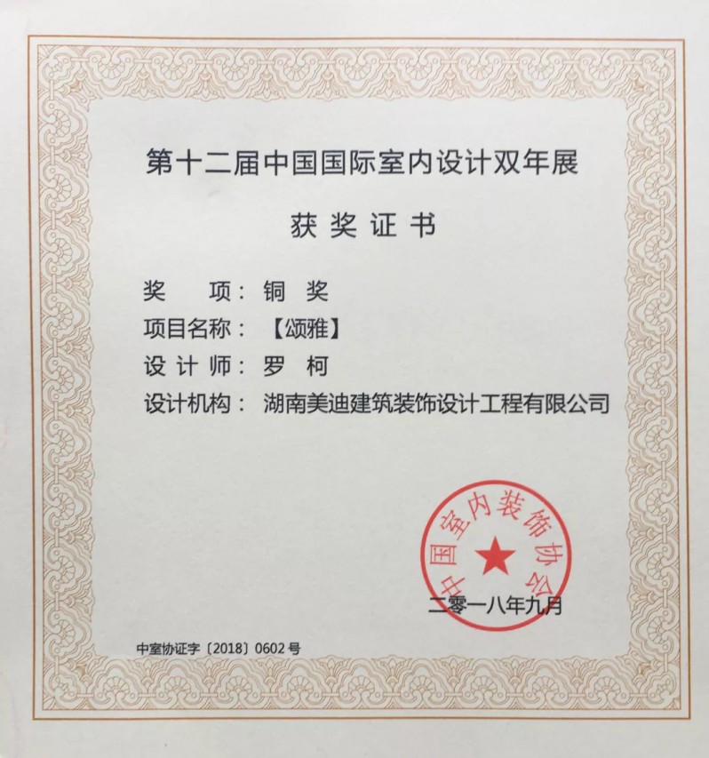 除美迪裝飾獲得“中國室內裝飾行業優秀企業”之外,美迪裝飾設計師趙益平(美迪大宅 設計院院長)、周港(總店 設計總監)榮獲“中國室內裝飾行業優秀設計師”稱號,設計師羅柯(總店 高級設計師)作品-《頌雅》、王雷(南店 主任設計師)作品-《我負丹青》獲得第十二屆中國國際室內設計雙年展-銅獎。