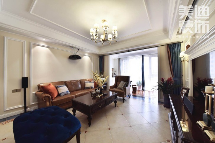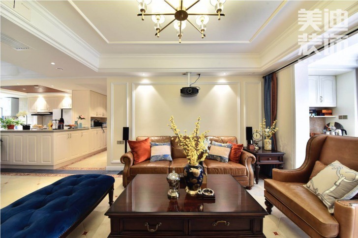 △沉穩厚重的茶幾,質地柔軟的棕色皮沙發優雅舒適,再加上橙色、藍色絲絨抱枕的點綴,給人以溫馨的感覺。