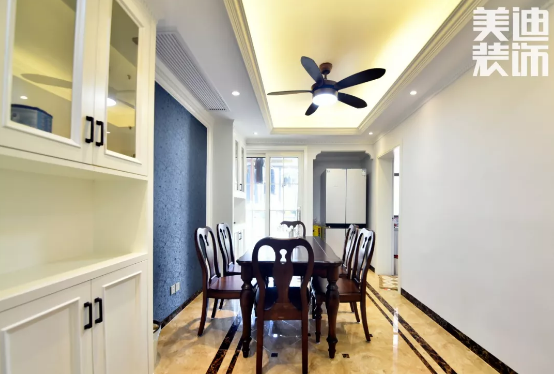 家居都選用深色實木,餐桌也不例外,為了不讓實木色和白色搭配太過單調,在兩側的收納柜中間,設計了跟客廳沙發墻一樣獨特的藍色背景墻。