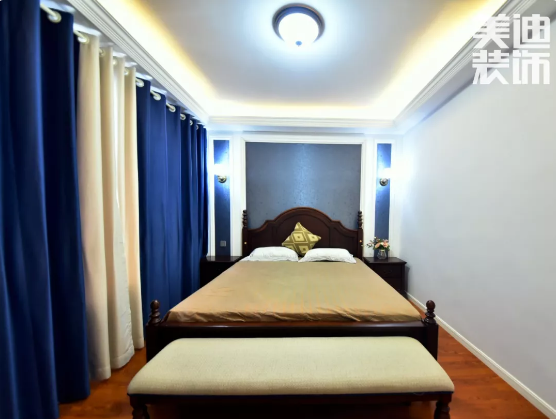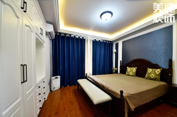 主臥窗簾顏色是藍白相見的色調,加上簡約的燈飾,搭配上深藍的家居,很符合小美風的獨特韻味,床頭柜的花點綴更是恰到好處