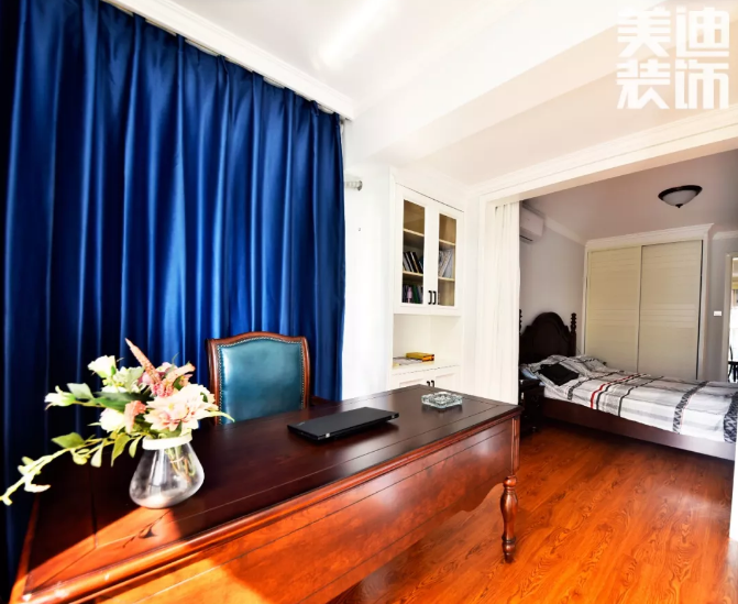 為滿足王先生的辦公需求,陳昌設計師將次臥的一部分和整個陽臺空間全部改成書房,深色的書桌和深綠色椅子,彰顯貴氣。
