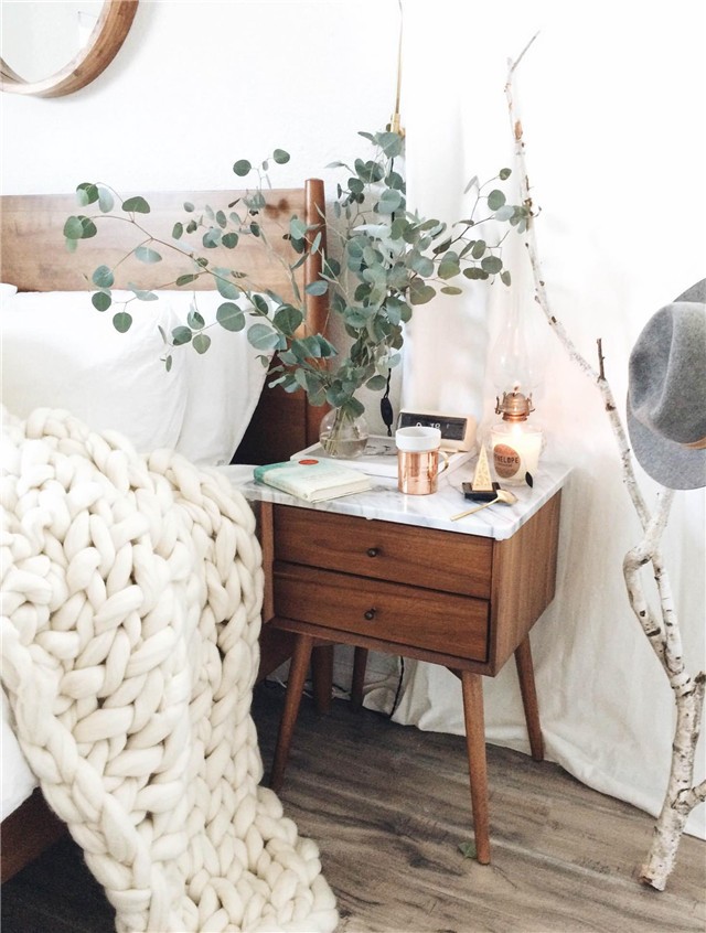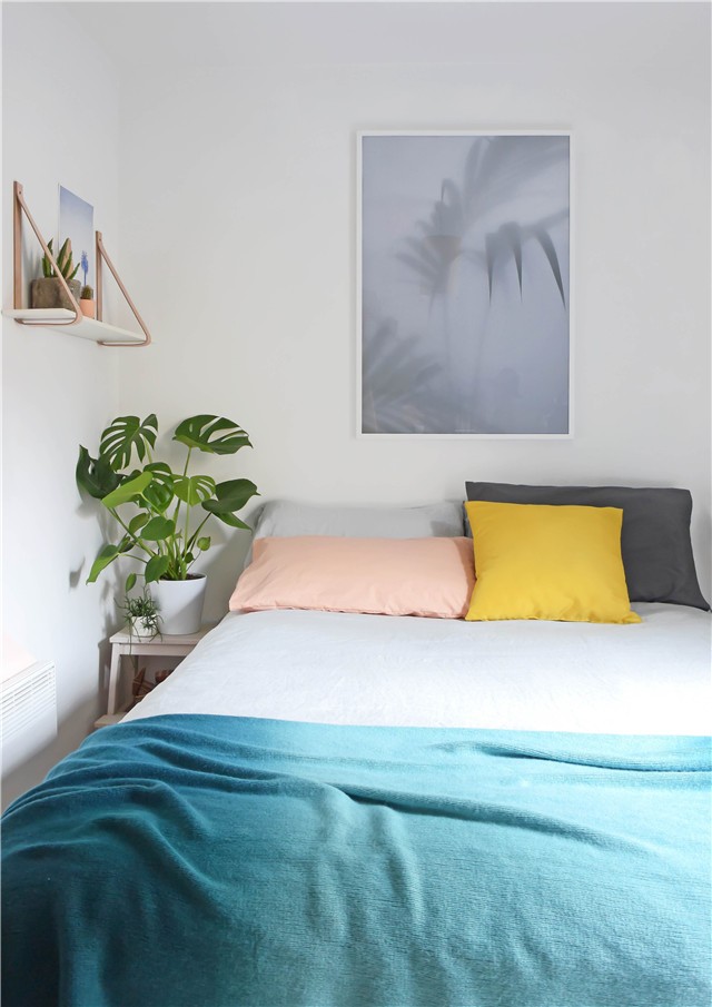 臥室不適合長(zhǎng)期放大型植物,但如今當(dāng)?shù)赖谋睔W風(fēng)家里,角落有一兩支真實(shí)的綠植做點(diǎn)綴為感官上增加清爽涼意。