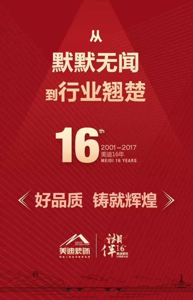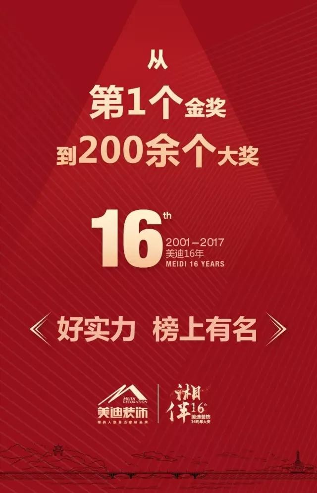 16年,美迪裝飾從默默無聞到行業翹楚,鑄就了“全國最佳設計企業”、“中國裝飾行業十大品牌”、“湖南十佳樣板工地企業”等榮譽。16年間,美迪不斷探索更加完善更加理想的家裝服務,不斷臻善家裝模式,為每個居住者勾畫精致生活,打造貼心的居住享受。