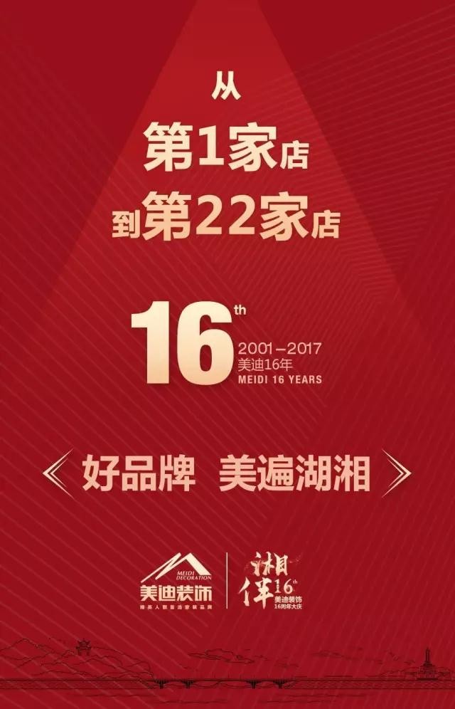 美迪裝飾成立于2001年,經過16年發展,實現了長沙、衡陽、岳陽、婁底、寧鄉等湖南14個地級市22家實體門店的版圖布局。美迪裝飾,誕生于湖南,成長于湖南,壯大于湖南。