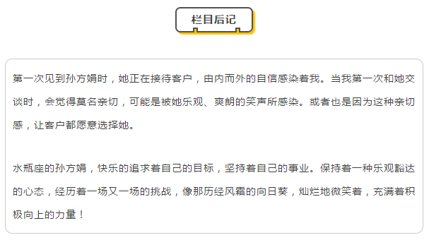 當(dāng)被問及到“如何提升業(yè)績”,孫方娟認(rèn)為需要感謝網(wǎng)銷與營銷人員前線的付出:聯(lián)系客戶、約客戶上門等事情,后期的接待結(jié)果不僅僅是個人的努力,更是整個團(tuán)隊(duì)合作的結(jié)果。