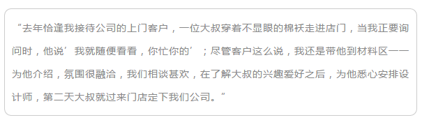 大叔選擇美迪時,說:“在來你們公司之前,我跑了長沙很多裝修公司,我只要一說是隨便看看的,他們就不搭理我,我也就出來了;但你們公司的接待不同,非常熱情地為我介紹,盡管我那樣說,你還是為我詳細(xì)地介紹,而且我對你安排的設(shè)計(jì)師很滿意”。
