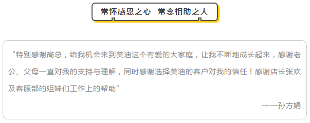 孫方娟說這件事情讓她感受到團(tuán)結(jié)的力量,團(tuán)隊(duì)的成員都在用實(shí)際行動真正踐行了那句“以客戶為中心”的服務(wù)理念,積極維護(hù)公司的形象與口碑,讓客戶滿意在美迪。