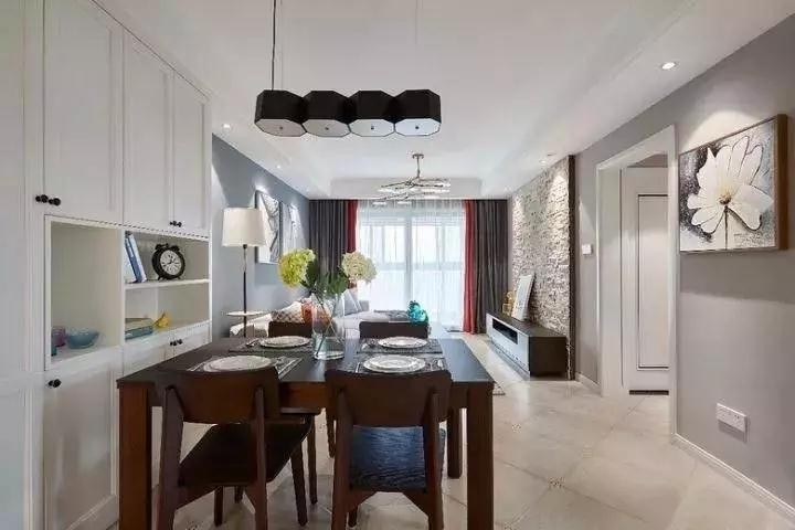 餐廳一邊背景墻用淺灰色乳膠漆裝飾,搭配素凈的花朵裝飾掛畫,自然干凈,看著非常舒服,餐桌選擇了偏美式復古風的深咖色,搭配同色系餐椅,顯得厚重而古樸,質(zhì)感而有力度,餐邊柜與玄關(guān)柜合并在一起,入頂式設(shè)計,自然大方的白色,與深色互補,不會讓人忽視其中一處。
