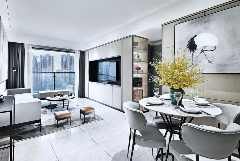 客餐廳在一個開放的空間內,整個風格格調保持一致。裝飾畫也是個系列的。