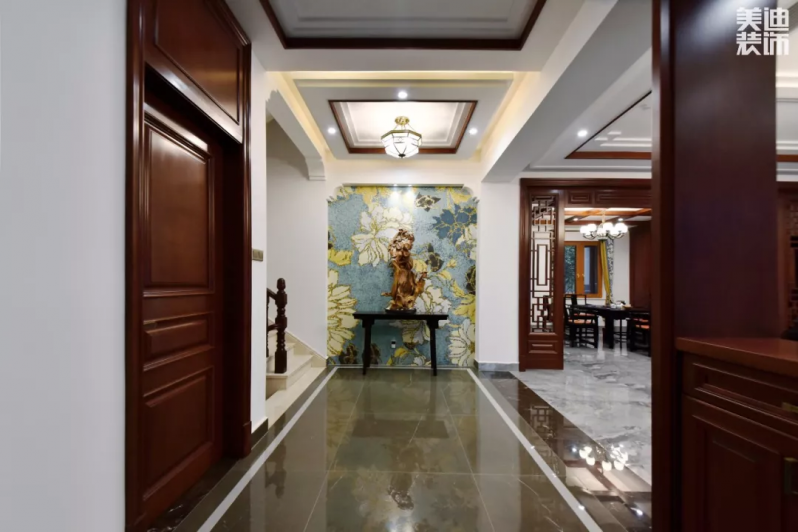 墻面運用的是中國風如意回紋造型,再掛上一副山水畫,充滿詩意的場景油然而生。