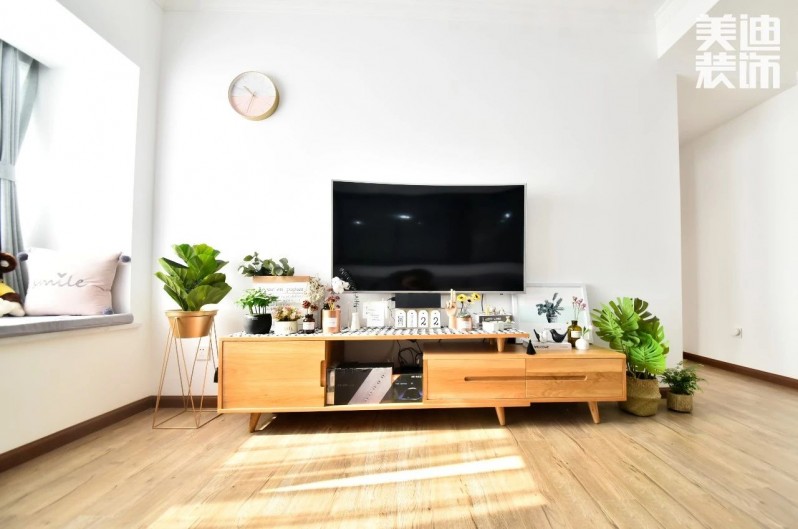 小敏特意為遮擋插座而購入的日歷小擺件,與原木色電視柜融為一體。綠植不僅可以凈化空間,也是室內必不可少的裝飾品。