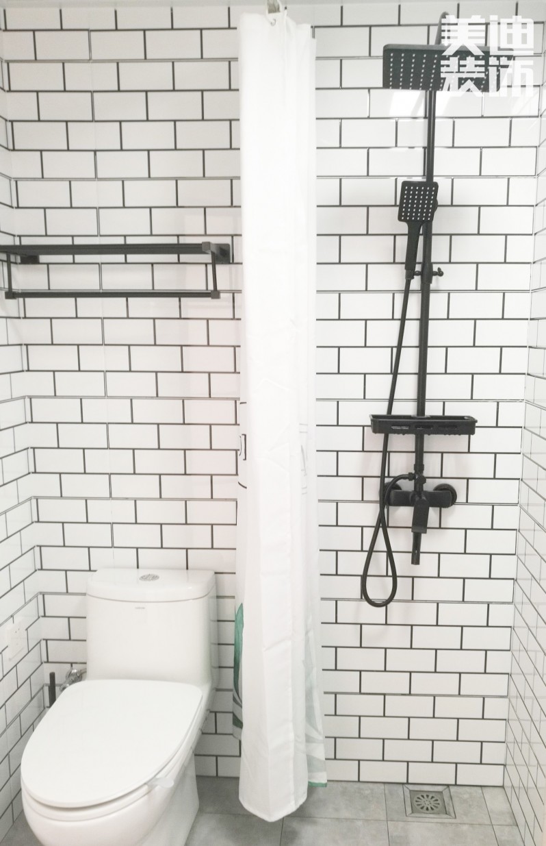 主衛墻面用黑白色的瓷磚工字鋪貼,大葉子圖案的浴簾,解決了私密性的同時也做到了干濕分離,便于清理。