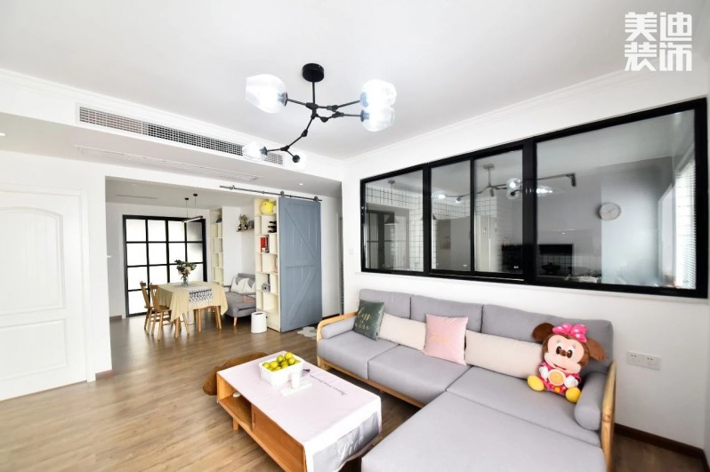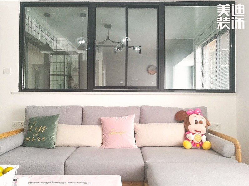 客廳和廚房之間,裝了一扇黑框玻璃窗戶,與電視背景大白墻相呼應,視覺上空間有放大的通透效果。飄窗的光線照進客廳,顯得格外寬敞明亮。