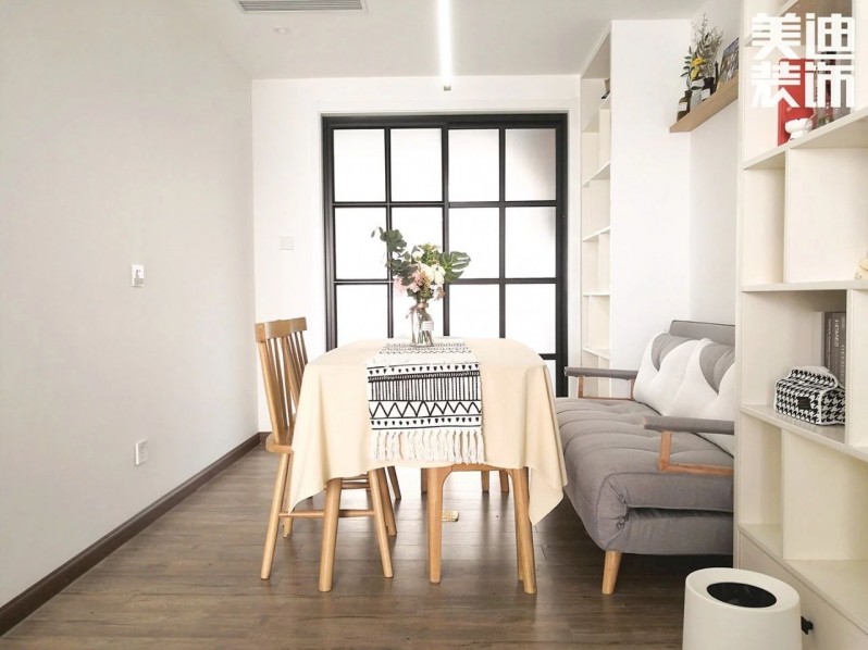 原戶型不是正南北通透,龔廣輝設計師把房間改造成通透式的餐吧,小敏平時可以在這看書。沙發兩旁做了收納柜,放置一些書籍、小物件和裝飾品。