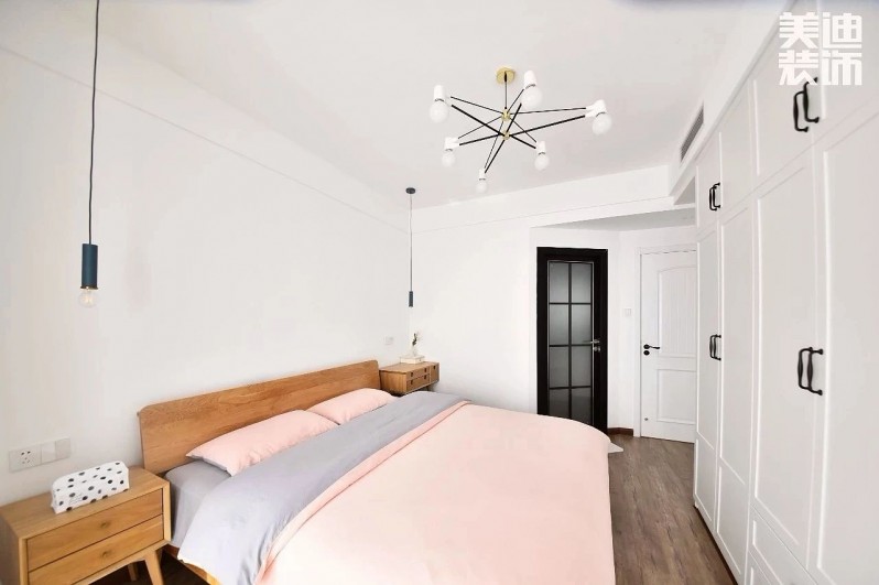 主臥被一片粉色占領,感覺來到女生夢寐以求的“魔法城堡”。床對面是一整面內嵌的壁柜,解決了小敏的收納問題。