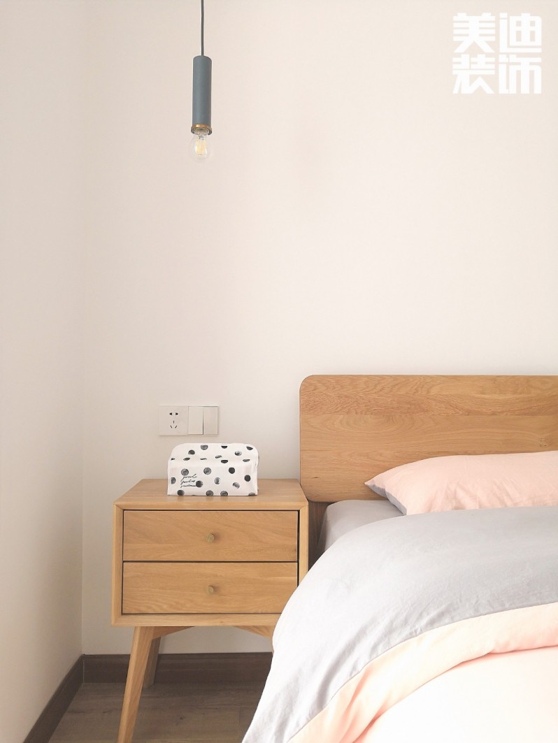 床頭金色小吊燈搭配白色墻面,提升空間的質感。沒有多余的構造,簡單的柜子上擺放小敏精心挑選的抽紙盒,柜子起到收納作用,紙盒起到美觀效果。