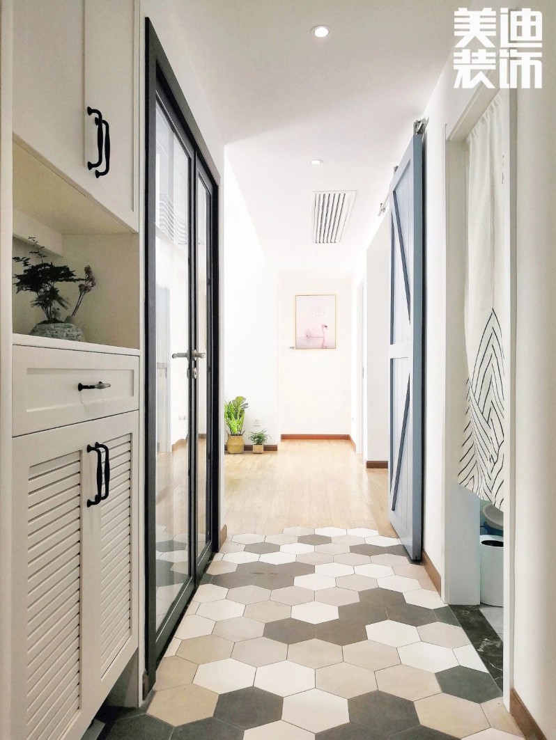 一打開門,映入眼簾的便是玄關,精美的六邊形蜂窩拼重點鋪設在過道,到了客廳就慢慢過渡到木地板。龔廣輝設計師還使用深淺不一的花色,豐富視覺上的層次感。